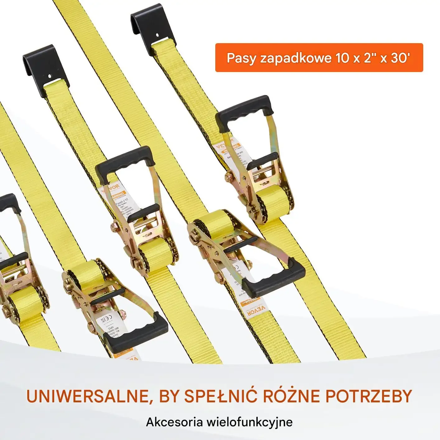 Materiał taśmy: Poliester. Grubość haka: 0,18 cala / 4,5 mm. Obróbka powierzchni: cynkowanie kolorowe. Wymiary przedmiotu: 2 cale x 30 stóp / 0,05 m x 9 m. Masa netto (wraz ze wszystkimi akcesoriami): 56,4 funta / 25,6 kg. Wytrzymałość na zerwanie: 10 000 funtów / 4536 kg. Ilości: 10 sztuk. Pasy są łatwe w użyciu i uniwersalne w zastosowaniach transportowych.