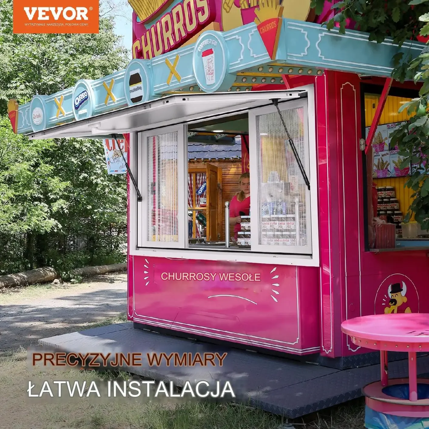 Okno jest idealne do zastosowania w food truckach, przyczepach gastronomicznych, stoiskach koncesyjnych i mobilnych jednostkach cateringowych, doskonale sprawdzi się także podczas festiwali kulinarnych czy eventów plenerowych.