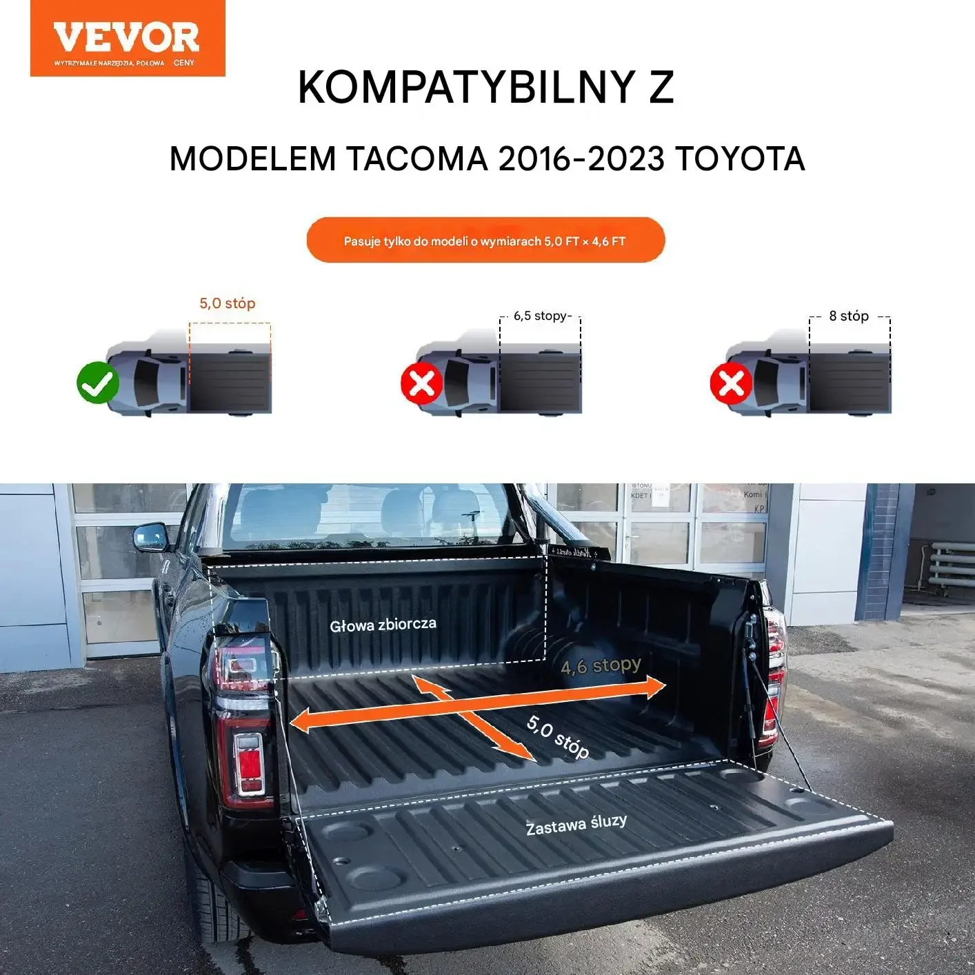 - ➡️ Pełne dopasowanie do Toyota Tacoma 2016–2023 5’ Bed