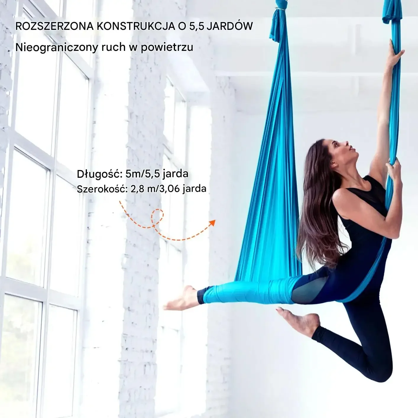 Hamak posiada rozszerzoną konstrukcję o długości 5 metrów i szerokości 2,8 metra, co pozwala na nieograniczony ruch w powietrzu. Odpowiednie wymiary zapewniają wystarczająco dużo miejsca do swobodnego wykonywania różnych pozycji i przejść podczas praktyki jogi.