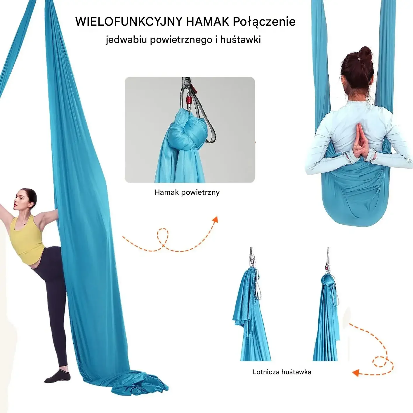 Wielofunkcyjny hamak łączy w sobie cechy jedwabiu powietrznego i huśtawki. Umożliwia stworzenie konfiguracji do jogi na jedwabiach (aerial silks) za pomocą połączenia obrotowego i węzła w kształcie ósemki. Możliwe jest również zbudowanie huśtawki powietrznej, wykorzystując karabińczyki i łańcuchy daisy (daisy chains). Ta wszechstronność pozwala na dostosowanie sprzętu do indywidualnych potrzeb i rodzaju treningu.