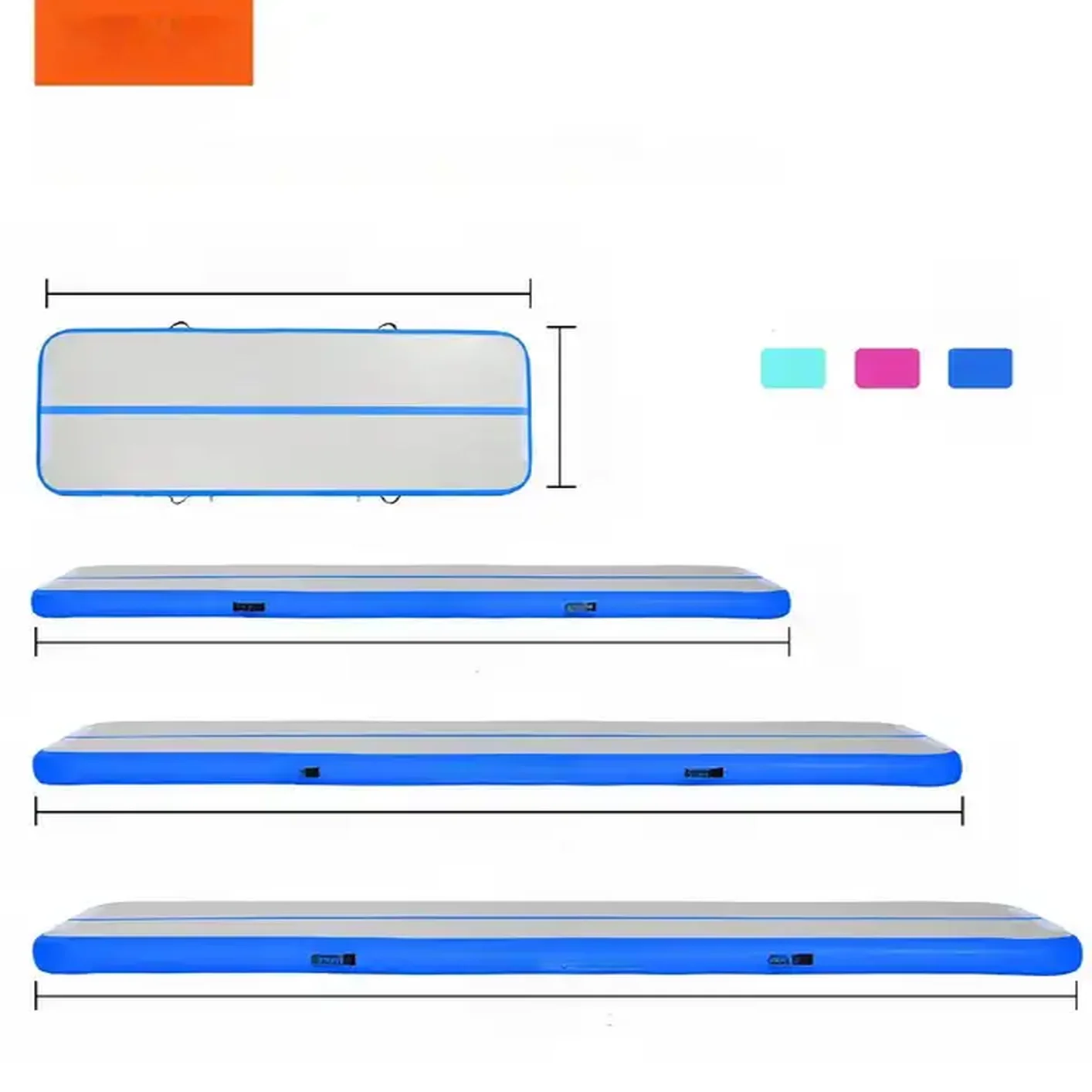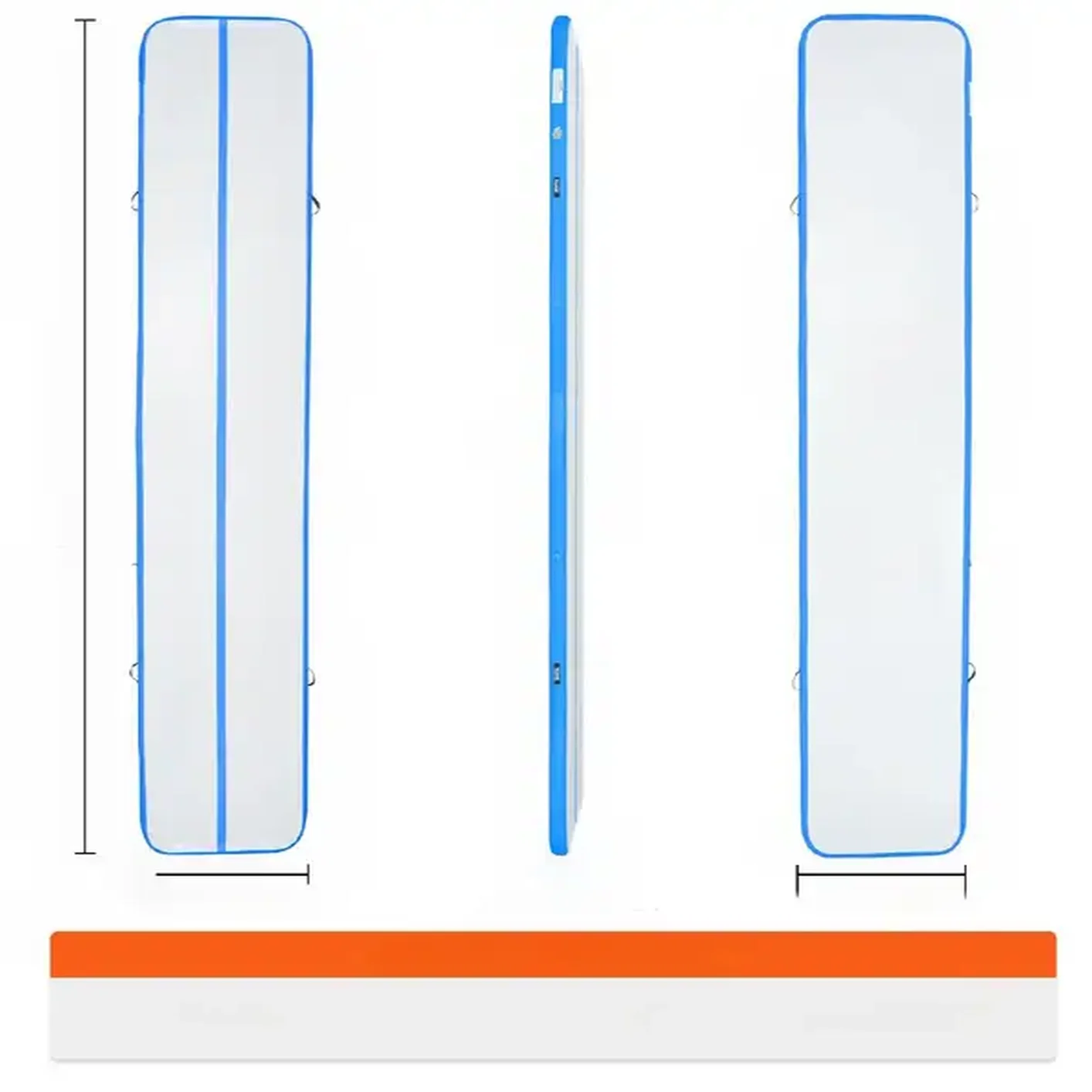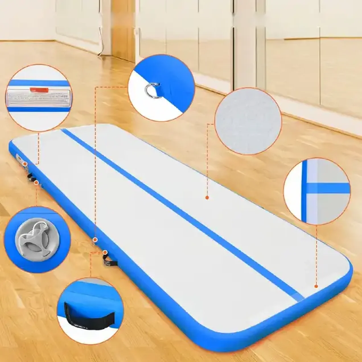 Nadmuchiwana mata gimnastyczna wykonana jest z wielowarstwowego kompozytowego materiału PVC ze wzmocnionymi szwami, co zapewnia lepszą szczelność i trwałość. Antypoślizgowa powierzchnia gwarantuje doskonałą przyczepność, odporność na ścieranie, wodoodporność oraz elastyczność, co sprawia, że mata jest bezpieczna w użyciu.