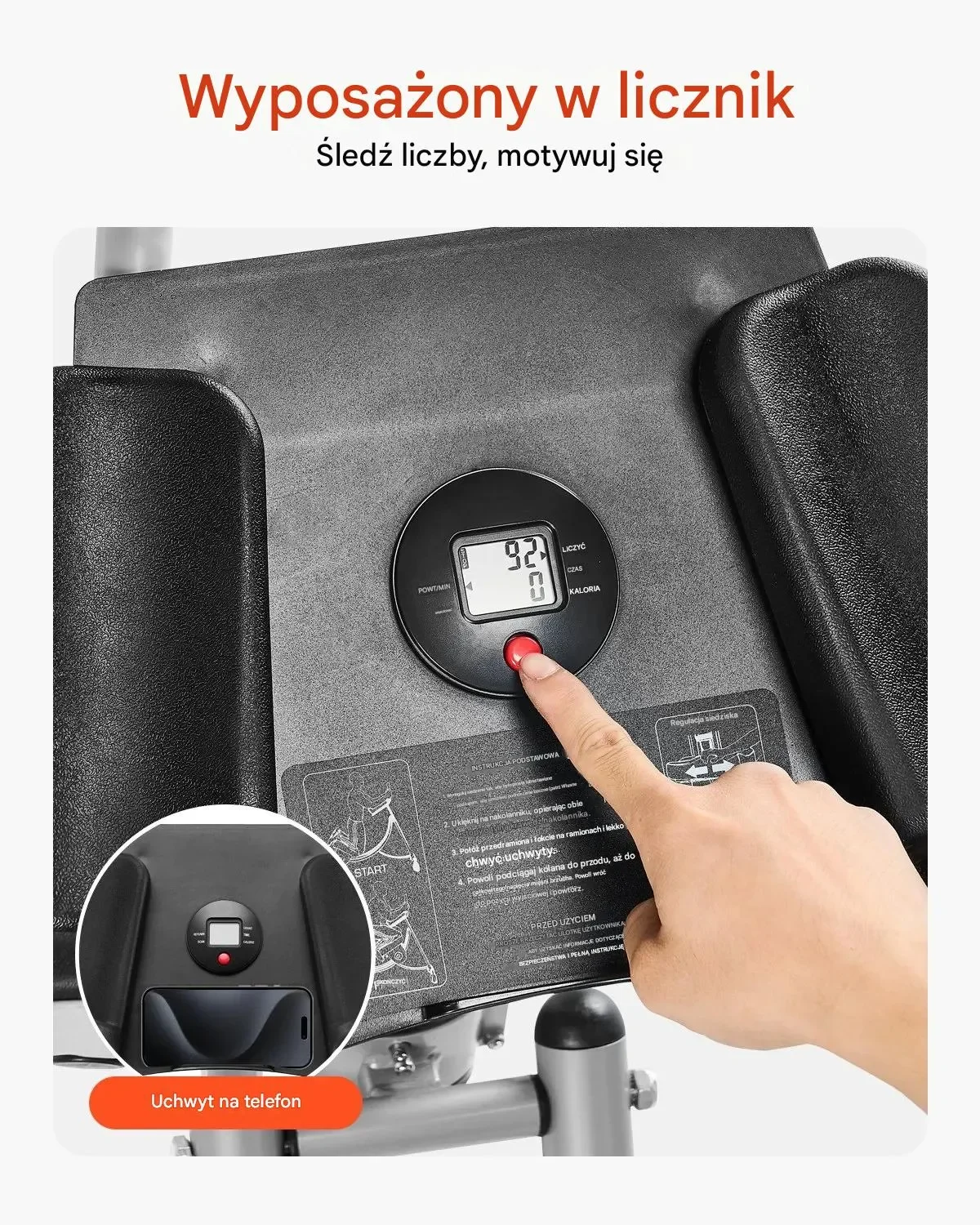 - Wyposażenie dodatkowe: Licznik powtórzeń, uchwyt na telefon