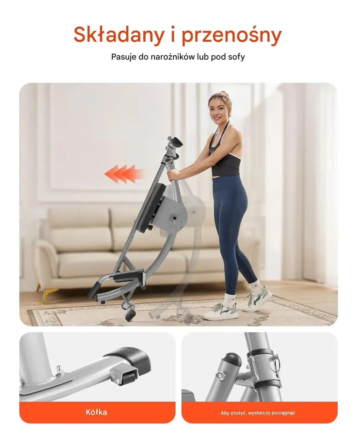 - ⭐ Oszczędność przestrzeni: Składana konstrukcja sprawia, że maszyna nie dominuje w mieszkaniu i może być schowana pod łóżko lub za drzwi.