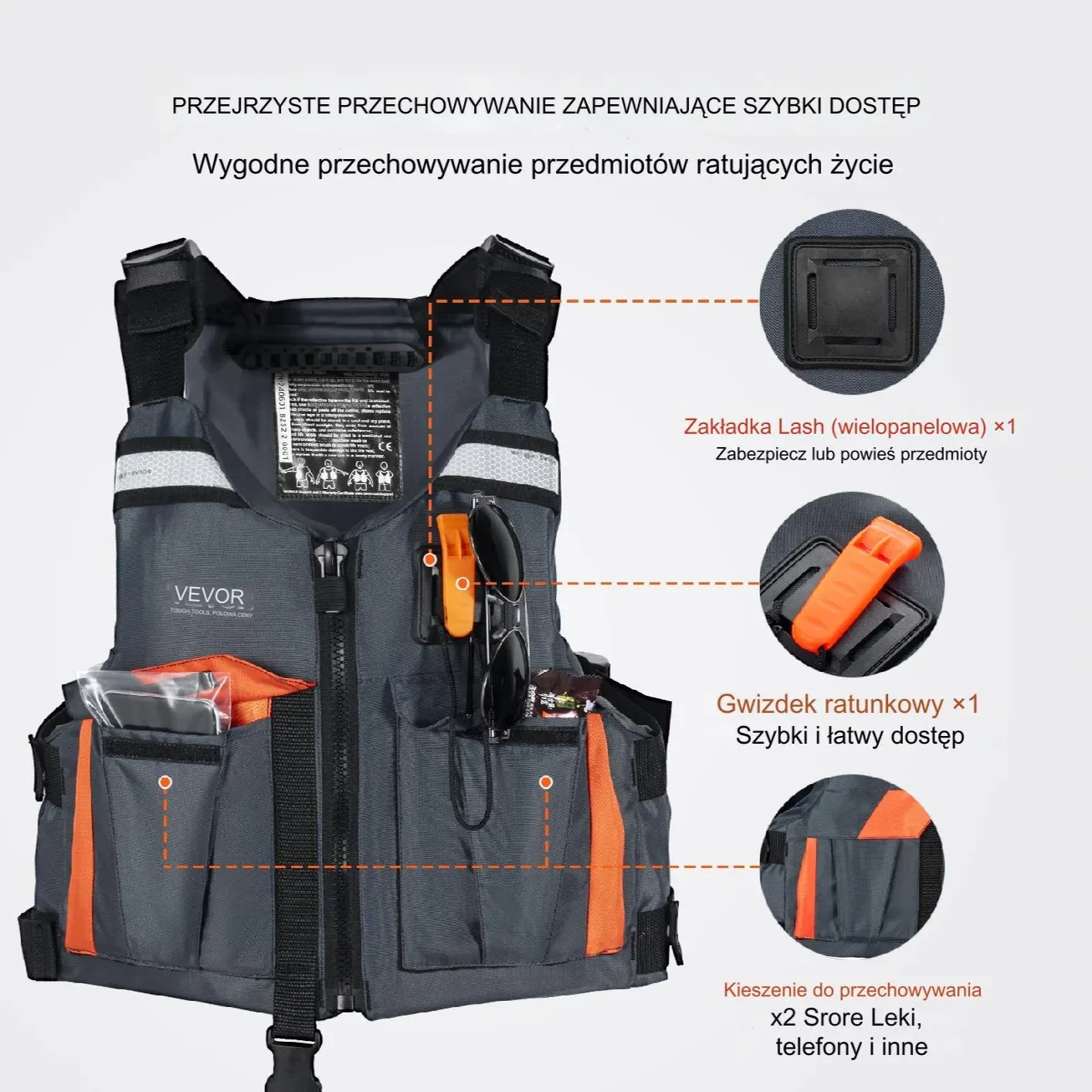 Dwie duże kieszenie kamizelek ratunkowych oferują dużo miejsca na niezbędne przedmioty, takie jak portfele, telefony i klucze. Klamra na klatce piersiowej zapewnia wygodne przechowywanie przedmiotów, takich jak gwizdki i okulary przeciwsłoneczne, ułatwiając do nich dostęp.