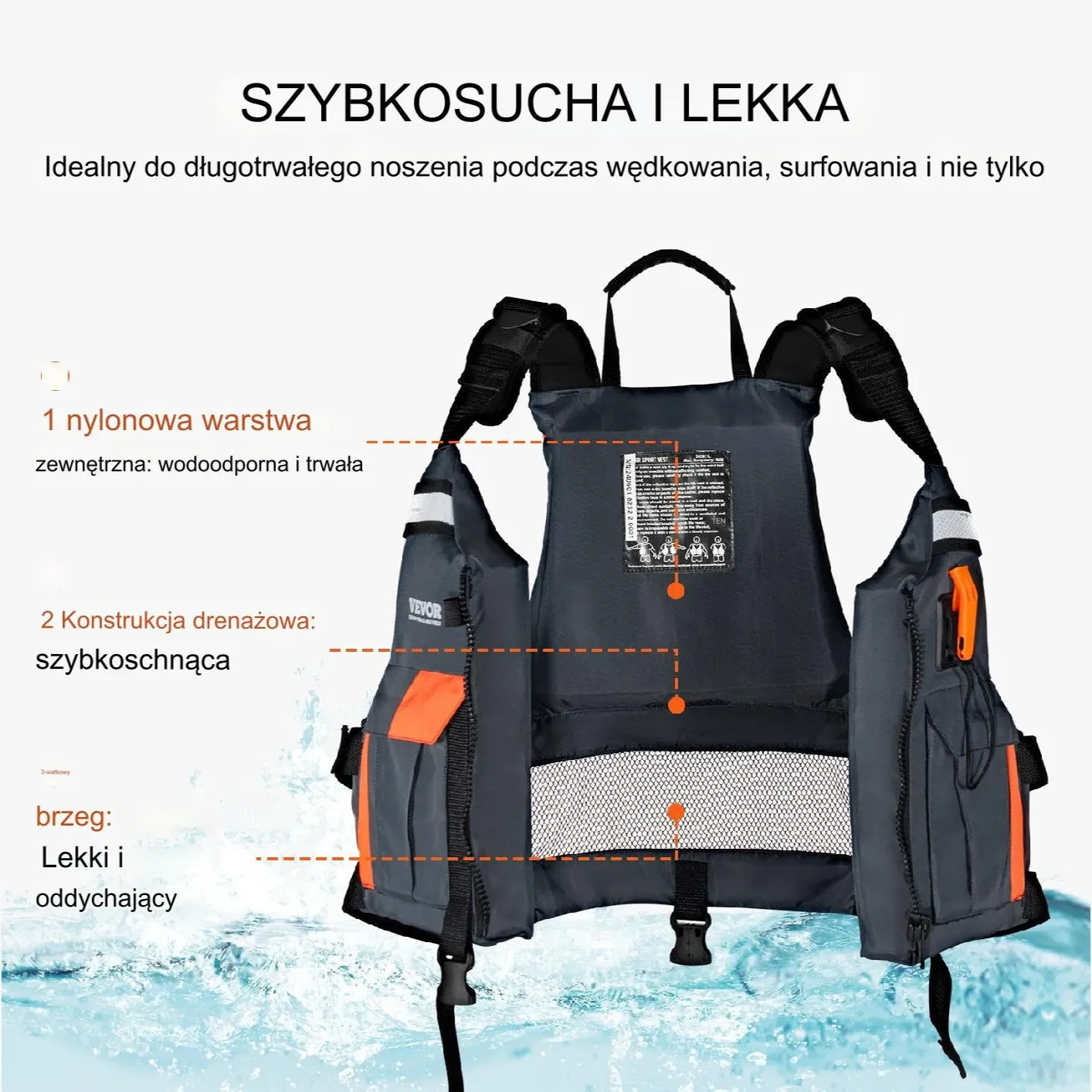 Wodoodporna bawełna wypornościowa EPE kamizelki kajakowej zapewnia stabilną pływalność. Zewnętrzny wodoodporny nylon utrzymuje bawełnę wypornościową suchą. Kamizelka ratunkowa spełnia normy bezpieczeństwa UL, zapewniając niezawodną ochronę.
