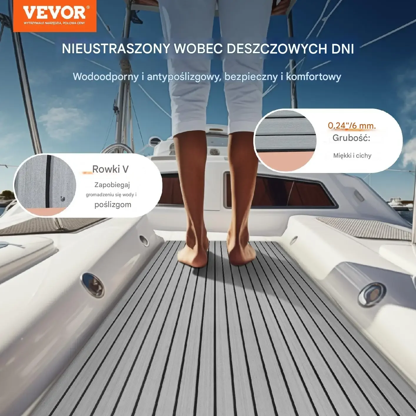 Wykonana z wysokiej jakości pianki EVA o grubości 6 mm, ta wykładzina pokładowa o wymiarach 240 x 116 cm zapewnia antypoślizgową, amortyzującą i wodoodporną powierzchnię. Specjalne rowki w kształcie litery „V” skutecznie odprowadzają wodę, zapobiegając poślizgom i gromadzeniu się wody na pokładzie.