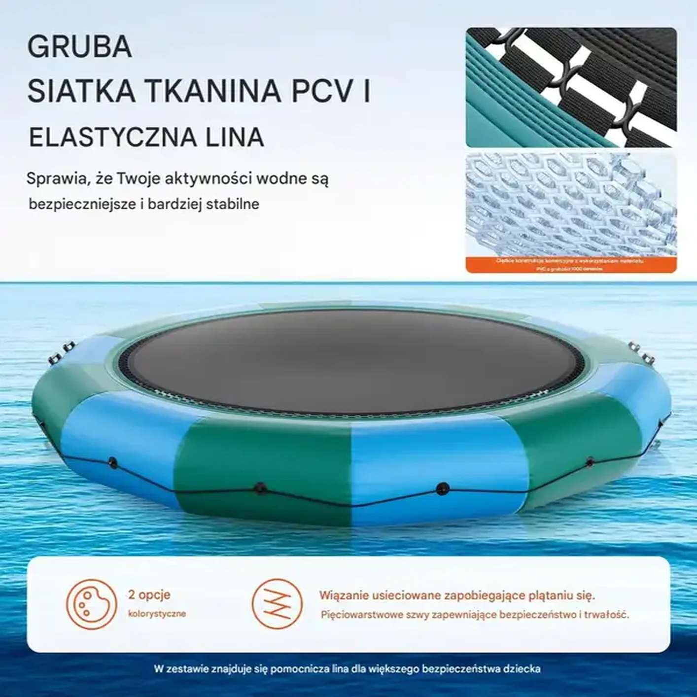 Dmuchana trampolina wodna o średnicy 470 cm to idealne rozwiązanie na letnie dni pełne zabawy i relaksu. Wykonana z wytrzymałego materiału PVC, zapewnia bezpieczeństwo i komfort użytkowania. Dzięki dużej powierzchni do skakania, może pomieścić jednocześnie kilka osób, dostarczając niezapomnianych wrażeń. Łatwa w montażu i transporcie, sprawdzi się zarówno na jeziorze, jak i w przydomowym basenie.