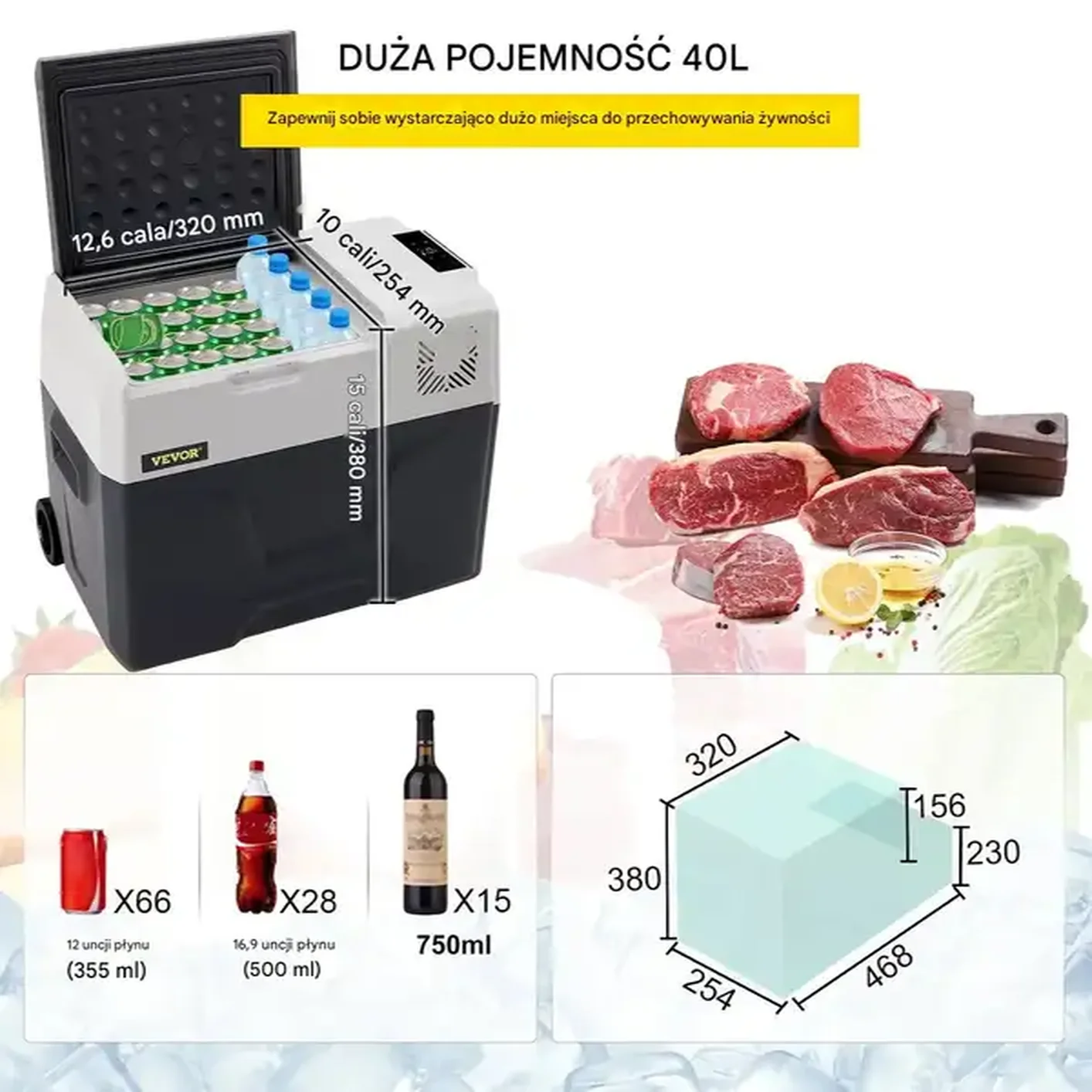 - ✅ Duża pojemność: 40 L – zmieści 46 puszek 330 ml, 34 butelki 550 ml lub 18 butelek 750 ml, idealna na napoje, przekąski, mięso i owoce