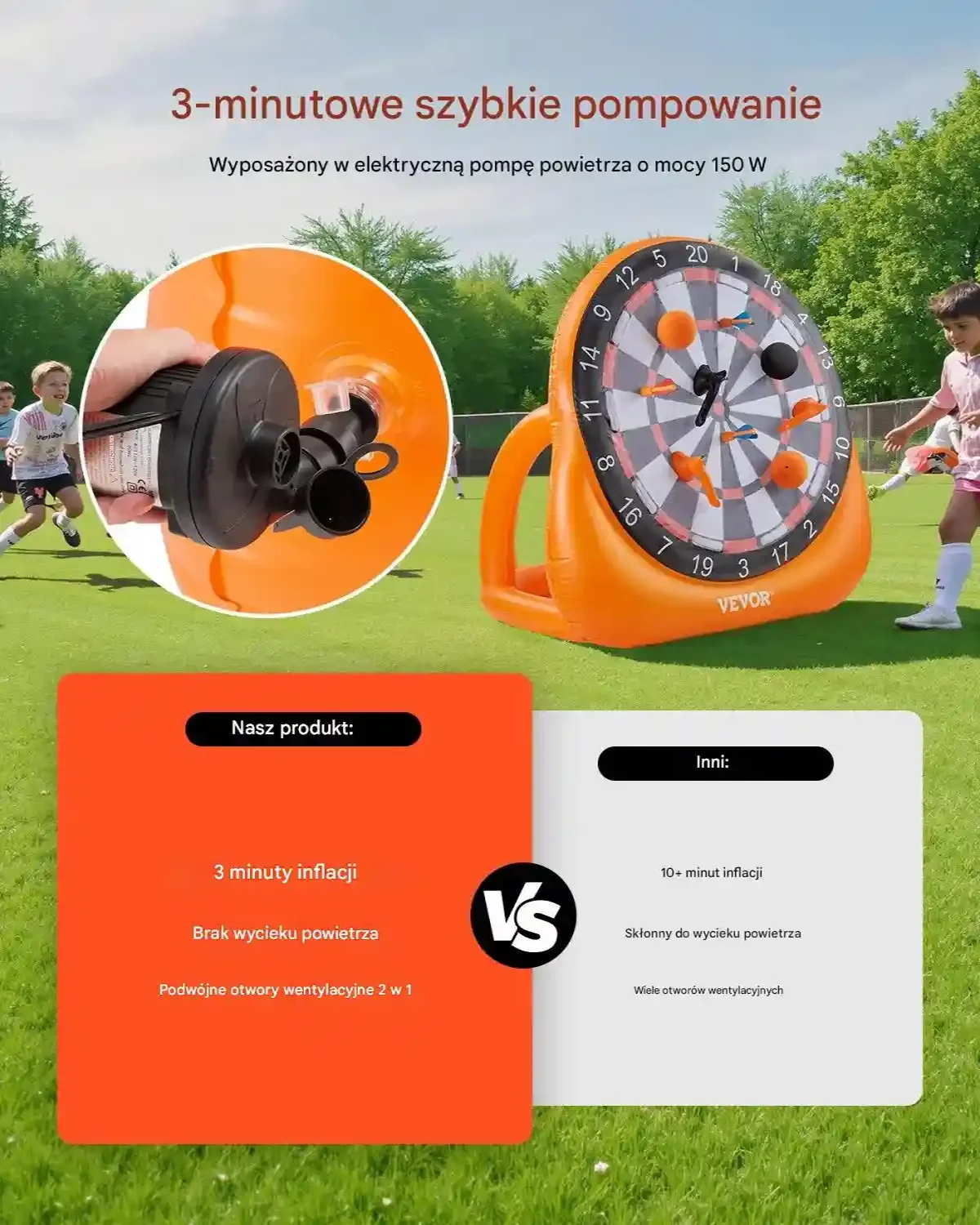 - ✅ Szybkie pompowanie: Dzięki wydajnej pompce elektrycznej tarczę można napompować w zaledwie 3 minuty. Zawór dwufunkcyjny umożliwia także szybkie spuszczenie powietrza po zakończonej grze.
