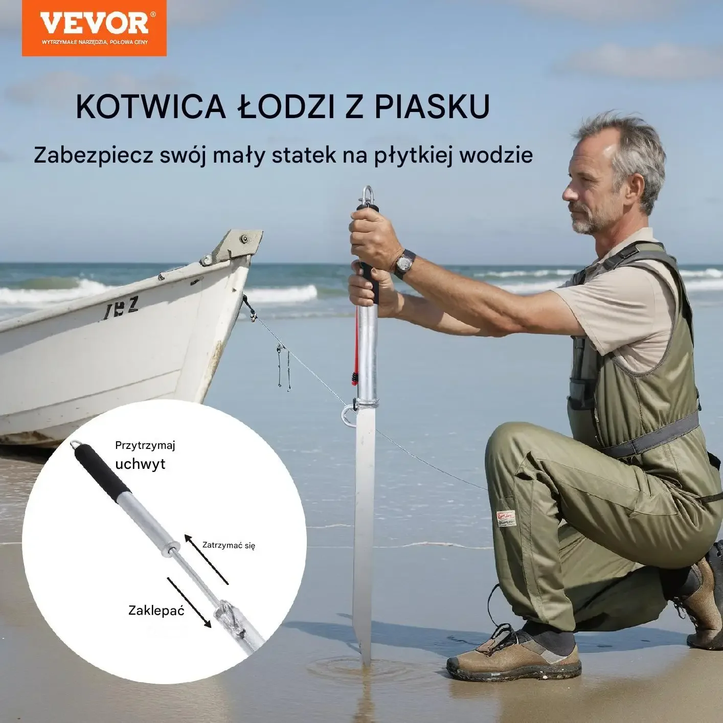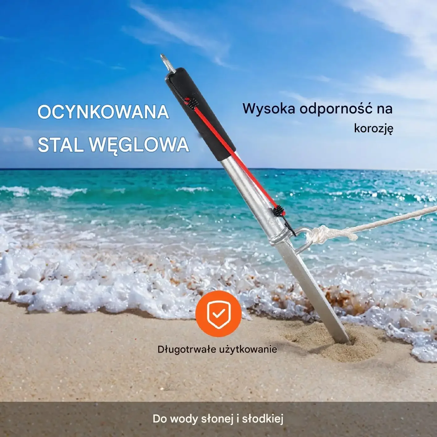 Wytrzymała kotwica piaskowa o długości 985 mm, wyposażona w innowacyjną konstrukcję samoudarową umożliwiającą szybkie i pewne wkręcanie w miękki i twardy piasek bez potrzeby użycia dodatkowych narzędzi. Doskonale sprawdza się na plażach, mieliznach, a także w płytkich wodach, zapewniając stabilne i bezpieczne mocowanie łodzi, pontonów czy motorówek.