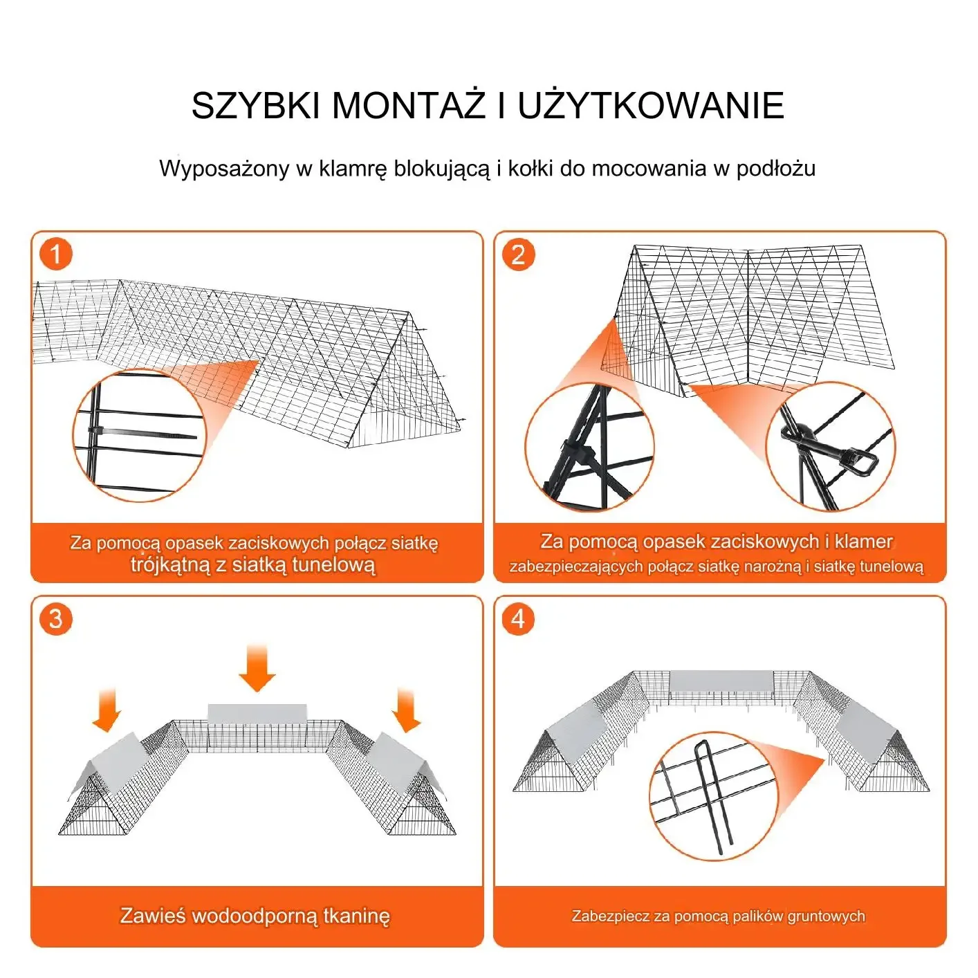 Profesjonalny tunel dla kurczaków i drobiu to bezpieczne, trwałe i praktyczne rozwiązanie do hodowli zwierząt na świeżym powietrzu. Dzięki stabilnej stalowej konstrukcji, przestronnemu wnętrzu i wodoodpornej osłonie chroni stado przed drapieżnikami i niesprzyjającymi warunkami pogodowymi. Świetny wybór zarówno dla małych działek, jak i większych gospodarstw.