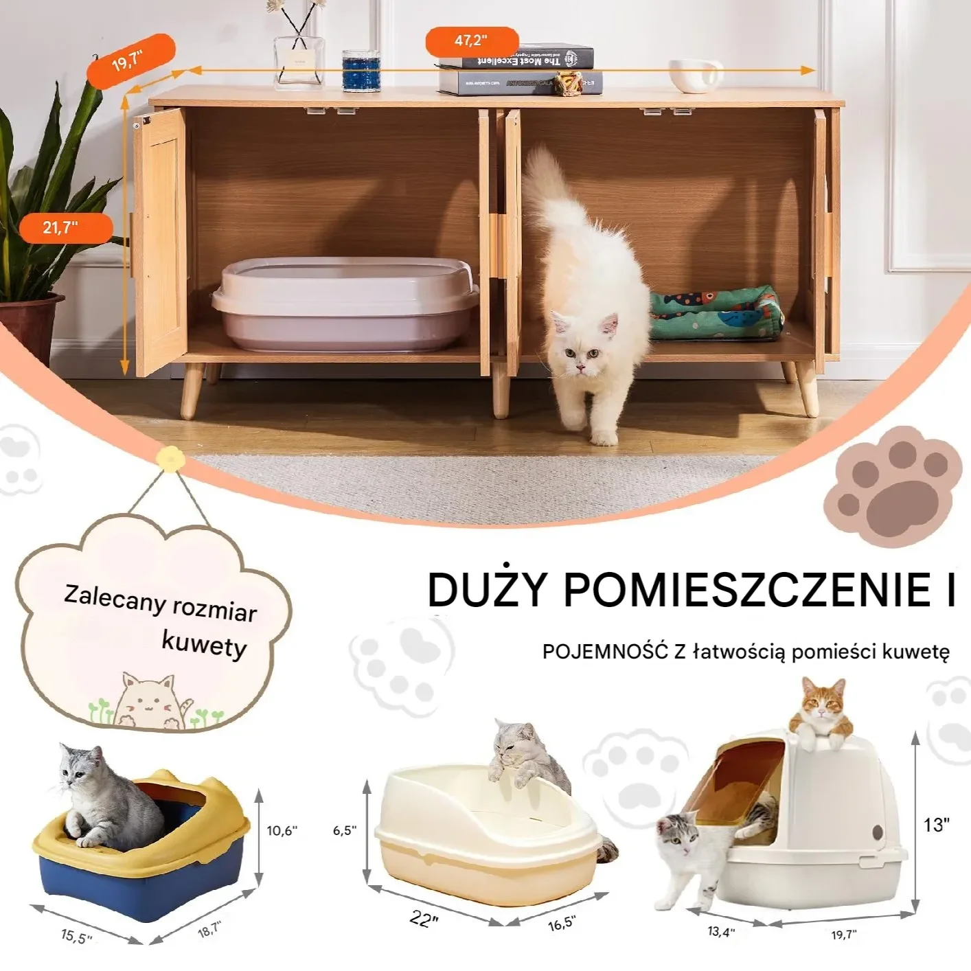 Stylowa i prosta szafka wielodrzwiowa, która skutecznie ukrywa kuwetę, tworząc schludną i prywatną przestrzeń dla Twojego kota. Wykonana z wysokiej jakości płyty wiórowej klasy P2, estetycznie dopasowuje się do wystroju wnętrza i łączy funkcjonalność z elegancją.