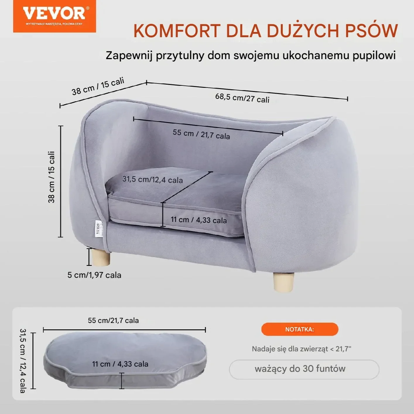 Przestronna sofa o wymiarach 68,5 × 38 × 38 cm, wykonana z solidnego drewna i miękkiej aksamitnej tkaniny, zapewnia wygodne miejsce do odpoczynku dla zwierząt różnej wielkości, od krótkowłosych kotów po golden retrievery. Solidna konstrukcja ma nośność do 30 kg, dostosowana do potrzeb małych i średnich psów.