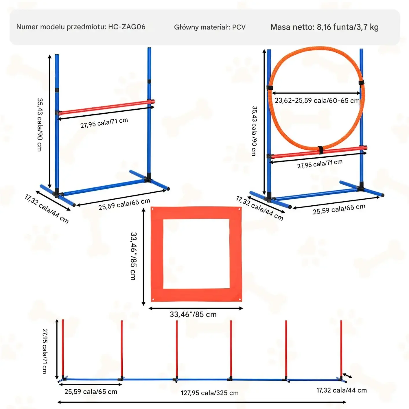 - Wszystkie elementy do zbudowania 4 przeszkód (hopka, obręcz, slalom, kwadrat)