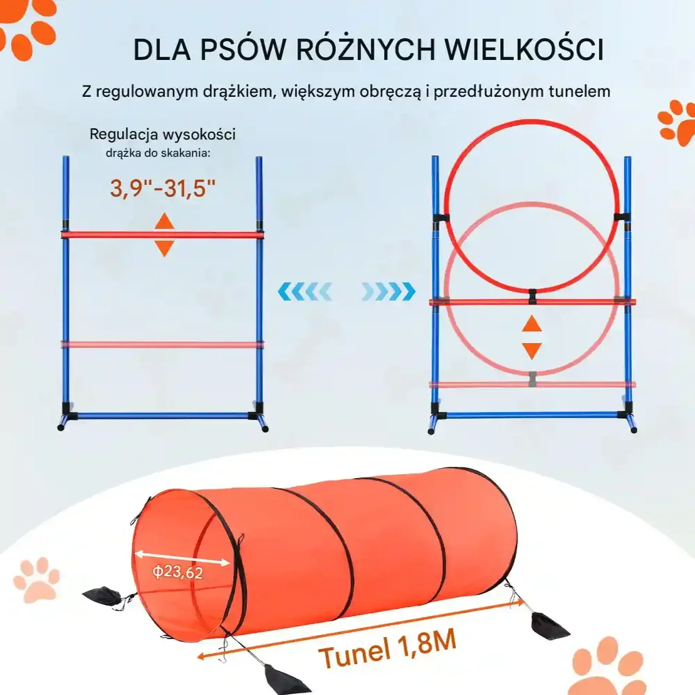 Nasz zestaw zawiera pręty do skakania o szerokości 71 cm, pierścień do skakania o średnicy 60 cm, 6 słupków podstawy, tunel o długości 200 cm oraz pudełko pauzowe, zaprojektowane, aby poprawić zwinność i posłuszeństwo Twojego psa, jednocześnie wzmacniając więź w zabawny i angażujący sposób.
