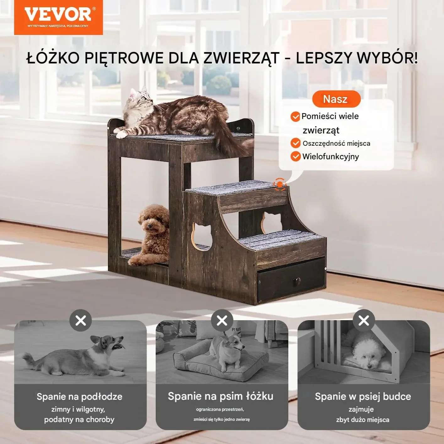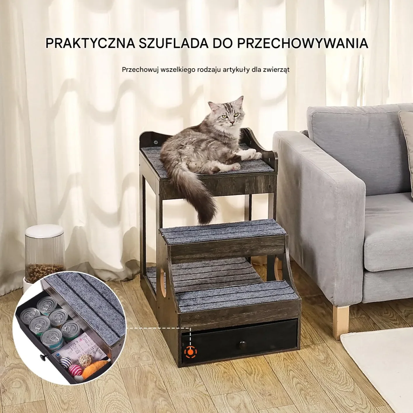 - ✅ Praktyczne przechowywanie: Koniec z bałaganem! Trzy przestronne szuflady wbudowane w schodki to idealne miejsce do przechowywania karmy, zabawek, smakołyków i innych akcesoriów Twojego pupila.