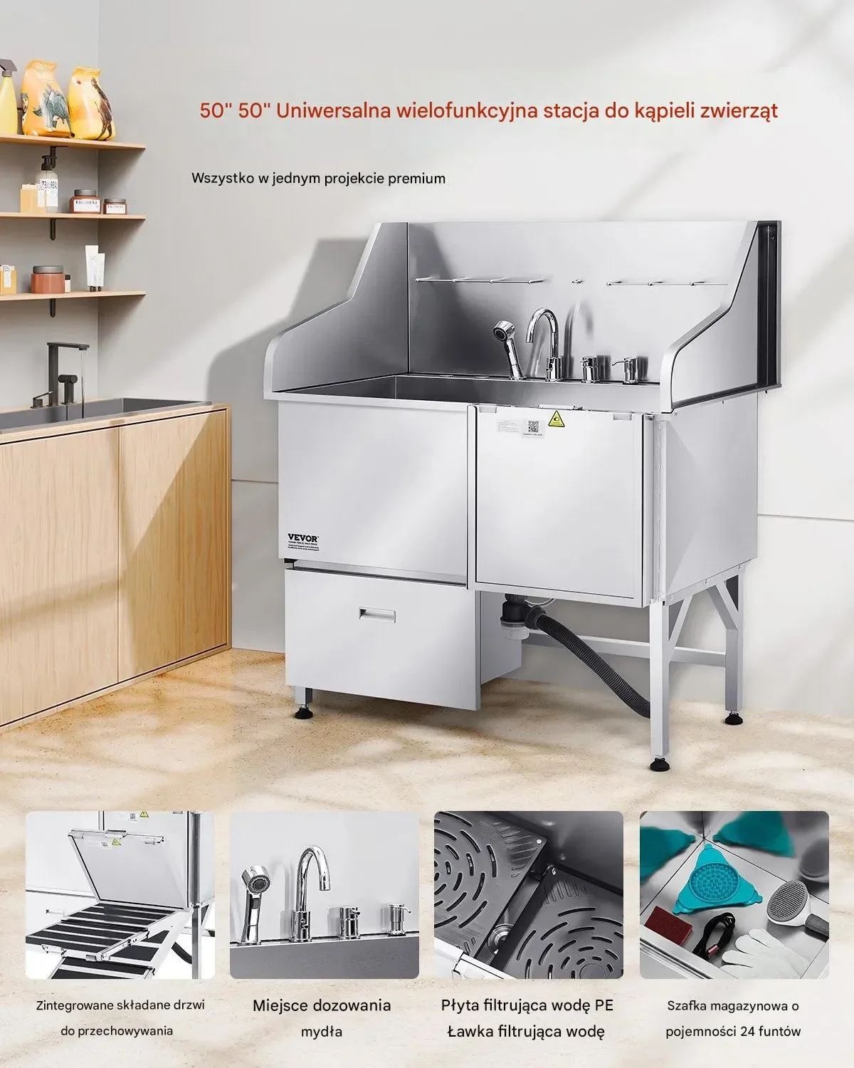 Start / Sklep / Supermarket / Artykuły dla zwierząt / Dla psów / Higiena i pielęgnacja / Stoły i wanny groomerskie / Wanna groomerska 127 cm stal 304 rampa antypoślizgowa szafka drzwi prawe