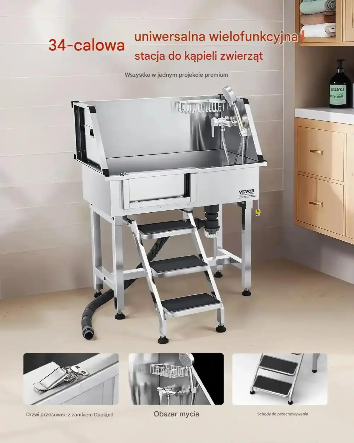 Profesjonalna Stalowa Wanna Groomerska z Prysznicem i Schodkami – Komfortowe Mycie Psów i Kotów