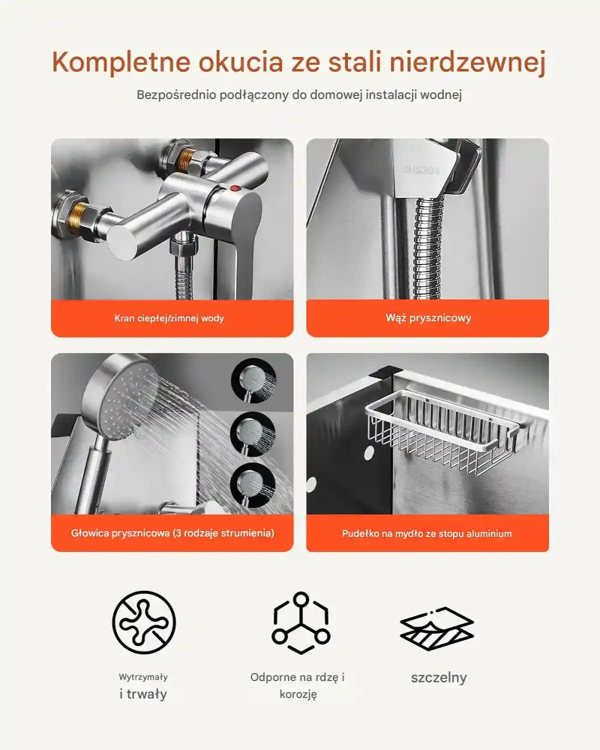 - Wyposażenie: Prysznic z baterią ciepła/zimna woda, półka na mydło, zestaw odpływowy, schodki antypoślizgowe