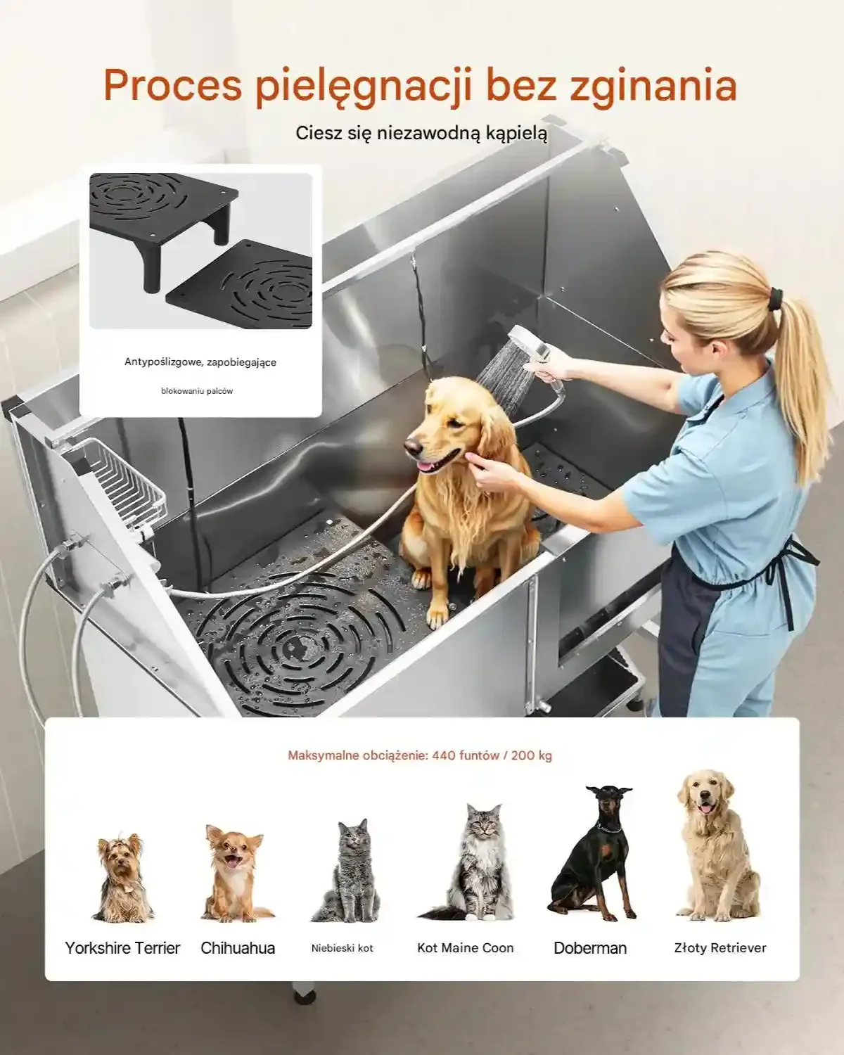 - ⭐ Salon groomerski: Ułatwia profesjonalne mycie, czyszczenie i pielęgnację psów i kotów.