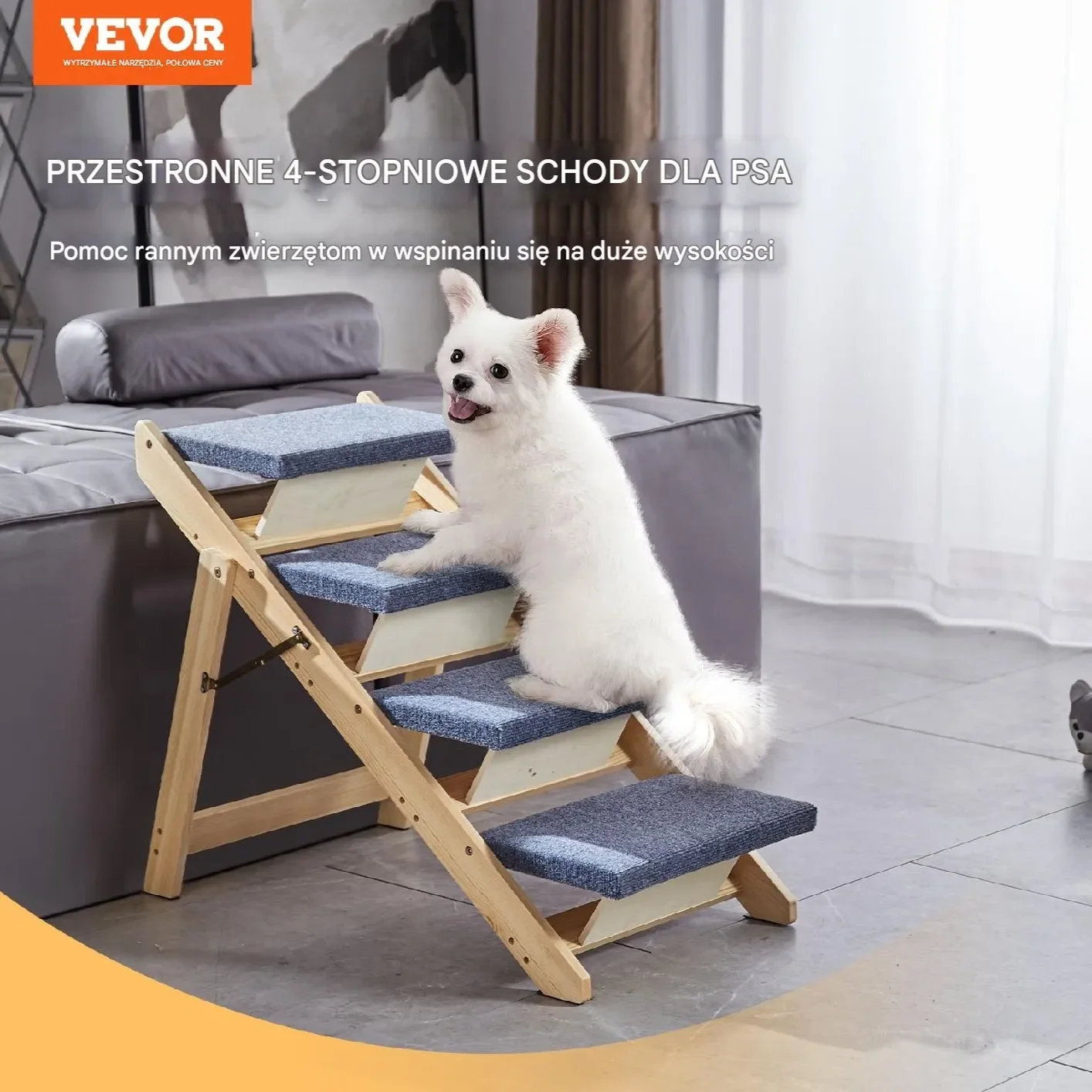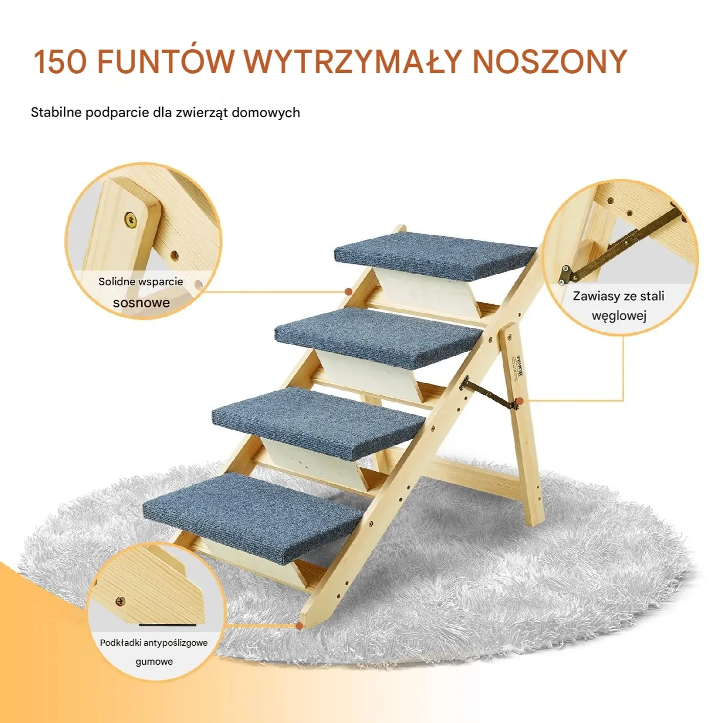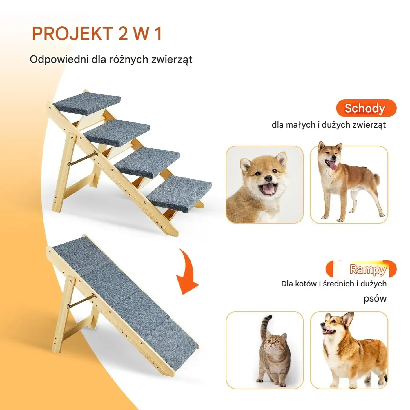 Praktyczne, składane drewniane schody z 4 stopniami, idealne dla małych, starszych lub niepełnosprawnych psów, ułatwiające dostęp do łóżek, sof oraz samochodów. Mogą być szybko przekształcone w rampę o większym nachyleniu, co jest wygodne dla kotów oraz psów średniej i dużej wielkości.