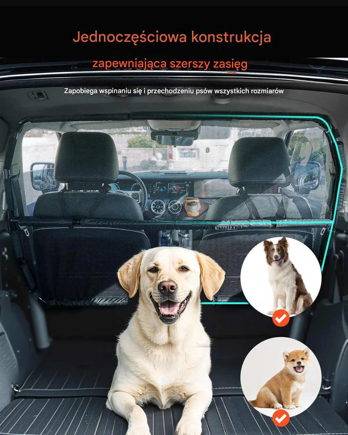 Zapewnia szeroki zasięg, co zapobiega wspinaniu się i przechodzeniu psów wszystkich rozmiarów, co dodatkowo zwiększa bezpieczeństwo w pojeździe.