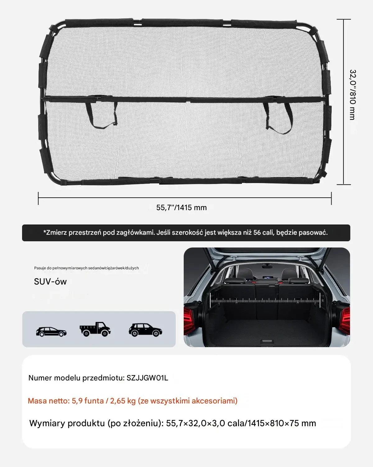 Produkt o wymiarach 55,7 x 32,0 x 3,0 cala (1415 x 810 x 75 mm). Pasuje do pełnowymiarowych SUV-ów, idealny dla przestrzeni pod zagłówkami.