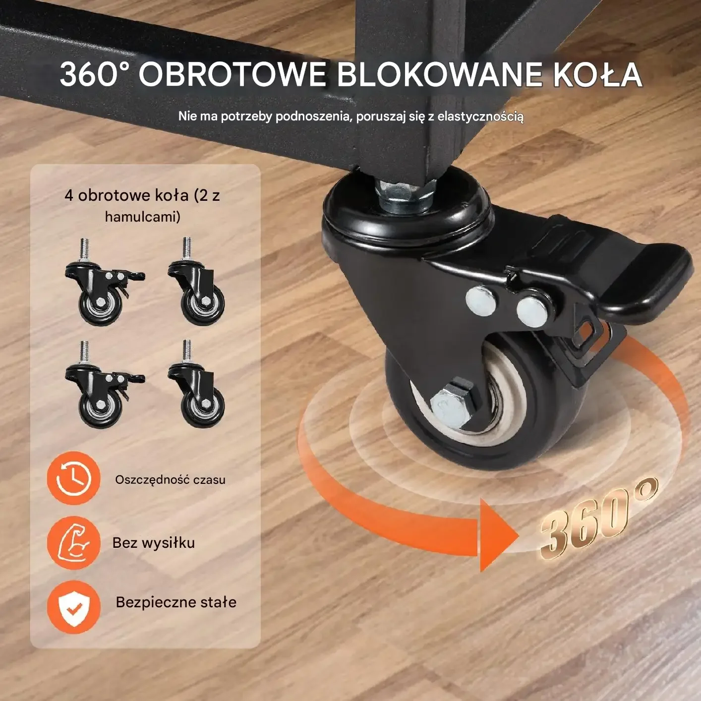 - ✅ Cztery obrotowe, blokowane koła 360° dla łatwego przemieszczania i stabilności