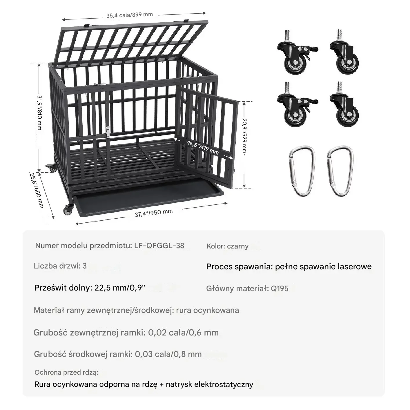 Nasza wytrzymała klatka dla psa o wymiarach 950 × 650 × 810 mm zapewnia przestronną przestrzeń dla średnich i dużych psów. Pozwala zwierzęciu swobodnie się poruszać, obracać, stać i leżeć. Górne drzwi umożliwiają bliską interakcję, podczas gdy przednie drzwi zapewniają łatwy dostęp.