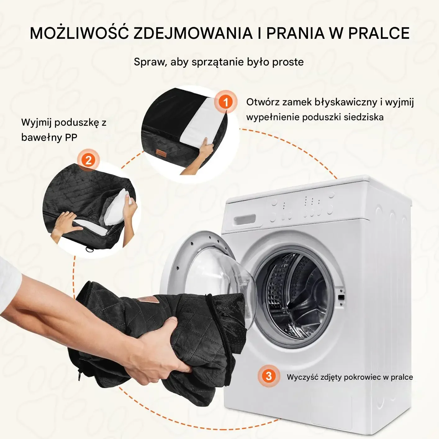Pokrowiec łatwo można rozebrać i wyprać. Wystarczy otworzyć zamek błyskawiczny, wyciągnąć wyściółkę poduszki, a następnie umieścić pokrowiec w pralce, co sprawia, że dbanie o czystość jest niezwykle proste.
