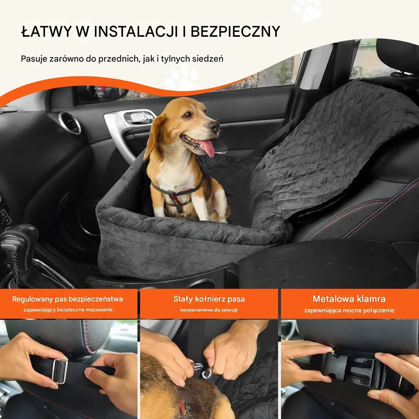 - ✅ Łatwy montaż: 2 regulowane pasy i dodatkowy pas bezpieczeństwa dla psa