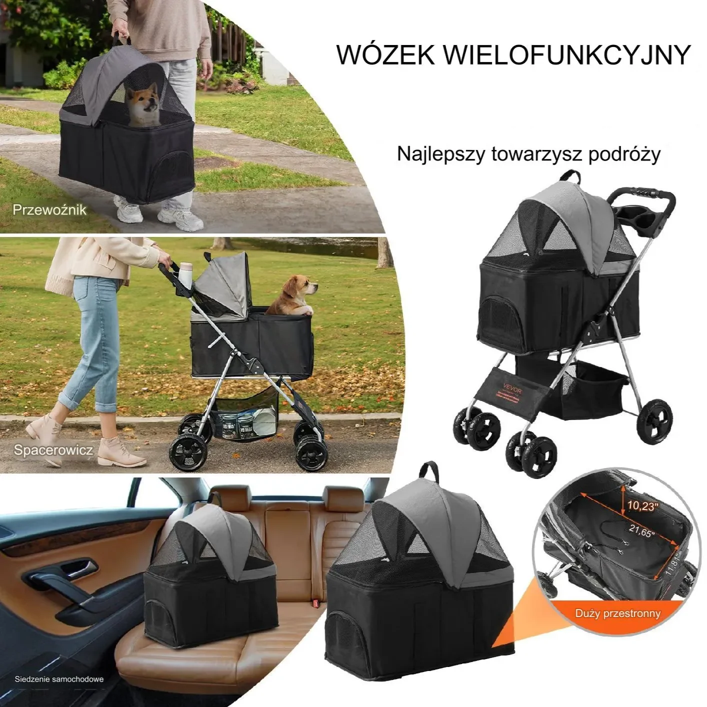 Wózek dla zwierząt, mogący udźwignąć do 16 kg, wyróżnia się solidną konstrukcją z aluminium oraz odporną na korozję powłoką, co zapewnia niezawodność i trwałość produktu. Bez względu na to, czy to spokojny spacer w parku, czy też długa podróż, wózek zapewnia komfort i bezpieczeństwo Twojemu zwierzakowi.