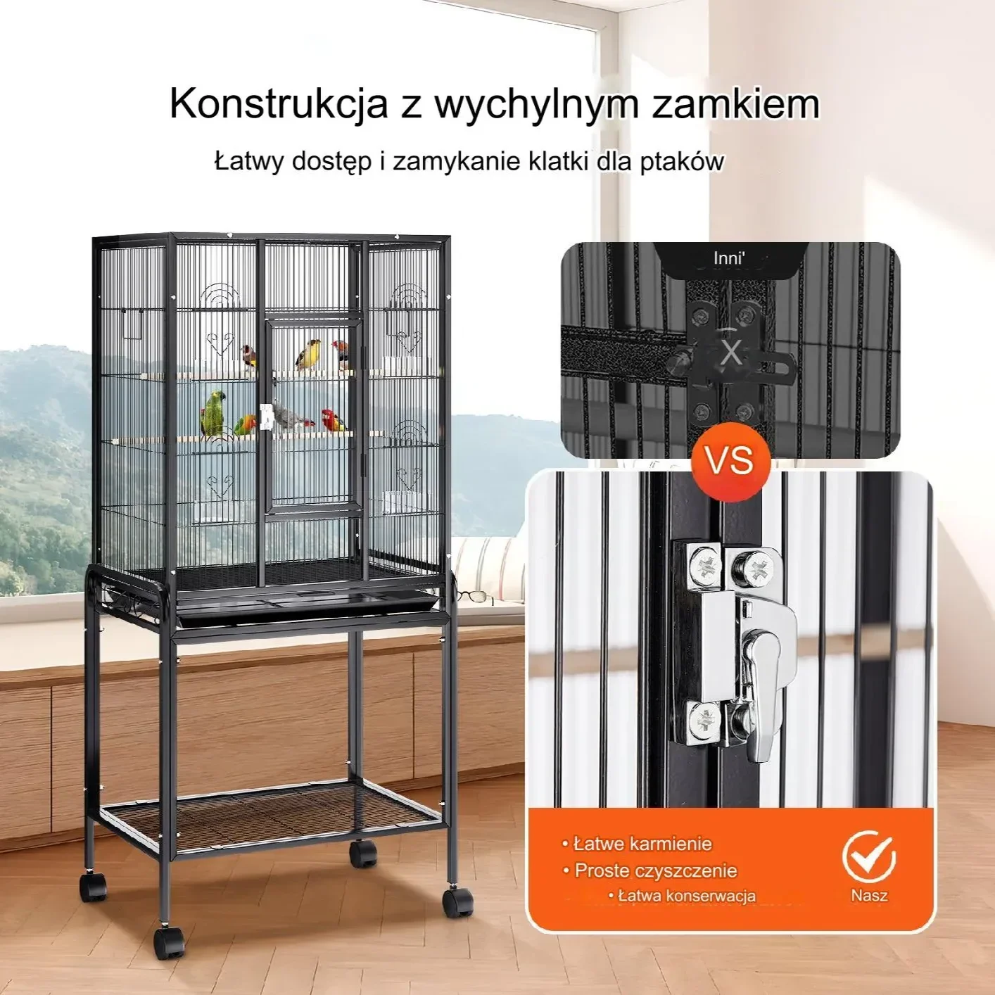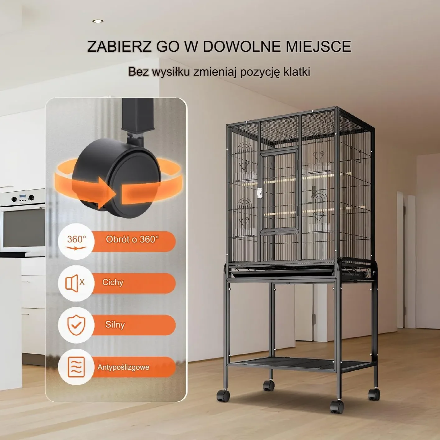 Duża klatka dla ptaków jest wyposażona w cztery solidne obrotowe koła, które gwarantują zarówno mobilność, jak i stabilność. Dzięki nim klatka porusza się płynnie, umożliwiając łatwe przemieszczanie się w dowolne miejsce bez potrzeby wytężonego wysiłku.