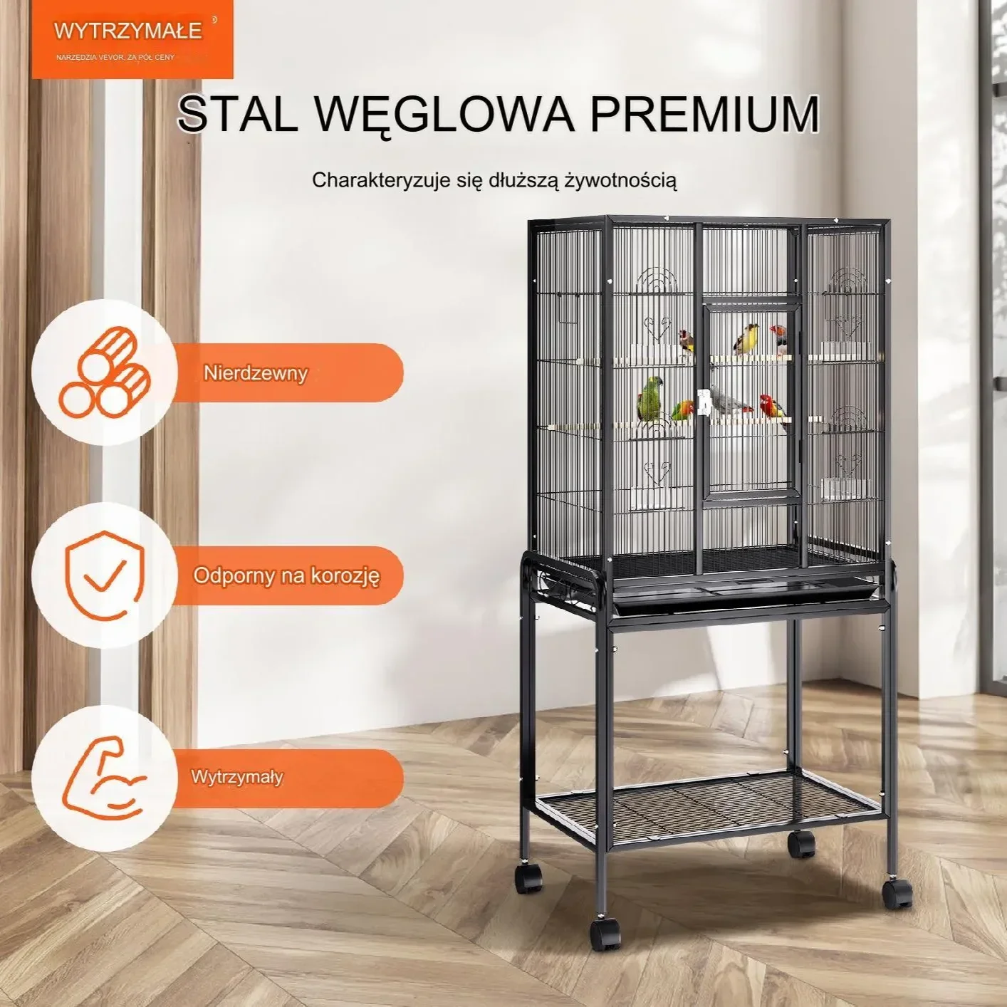 Wykonana z wysokowytrzymałej stali węglowej, klatka dla ptaków charakteryzuje się dużą wytrzymałością i sztywnością, zapewniając solidne wsparcie strukturalne. Jest to kluczowe dla zachowania kształtu i integralności klatki oraz zapobiegania deformacjom czy uszkodzeniom, zapewniając Twoim ptakom bezpieczne miejsce.