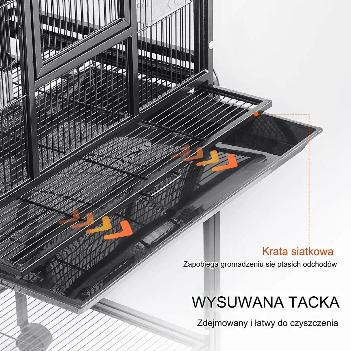 Wyjmowana, wysuwana taca ułatwiająca czyszczenie sprawia, że konserwacja klatki jest szybka i prosta. Kratka siatkowa zapobiega kontaktowi zwierząt z odpadami, dbając o higienę i wygodę ptaków, co ułatwia utrzymanie czystości.