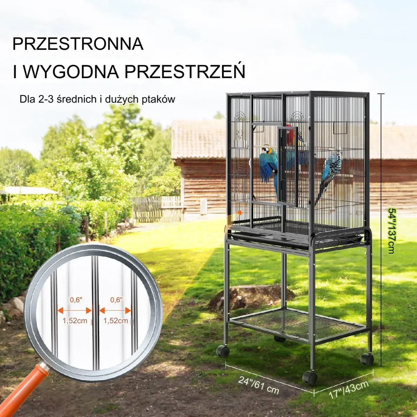 Oferująca wymiary 137x43x61 cm, z odstępem w siatce wynoszącym 1,5 cm ,klatka dla ptaków stwarza obszerną, komfortową przestrzeń życiową. Twoje ptaki mogą swobodnie przemieszczać się, odpoczywać i rozciągać skrzydła.