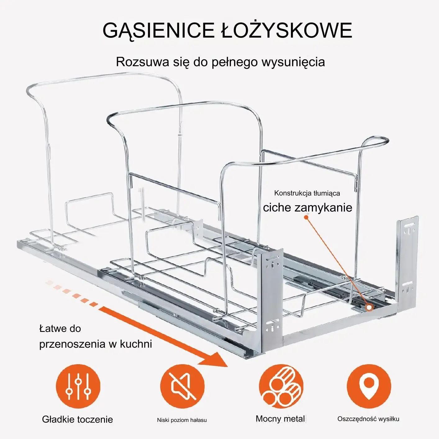 Nasz wysuwany kosz na śmieci pod blatem nadaje się do montażu w szafkach dolnych.