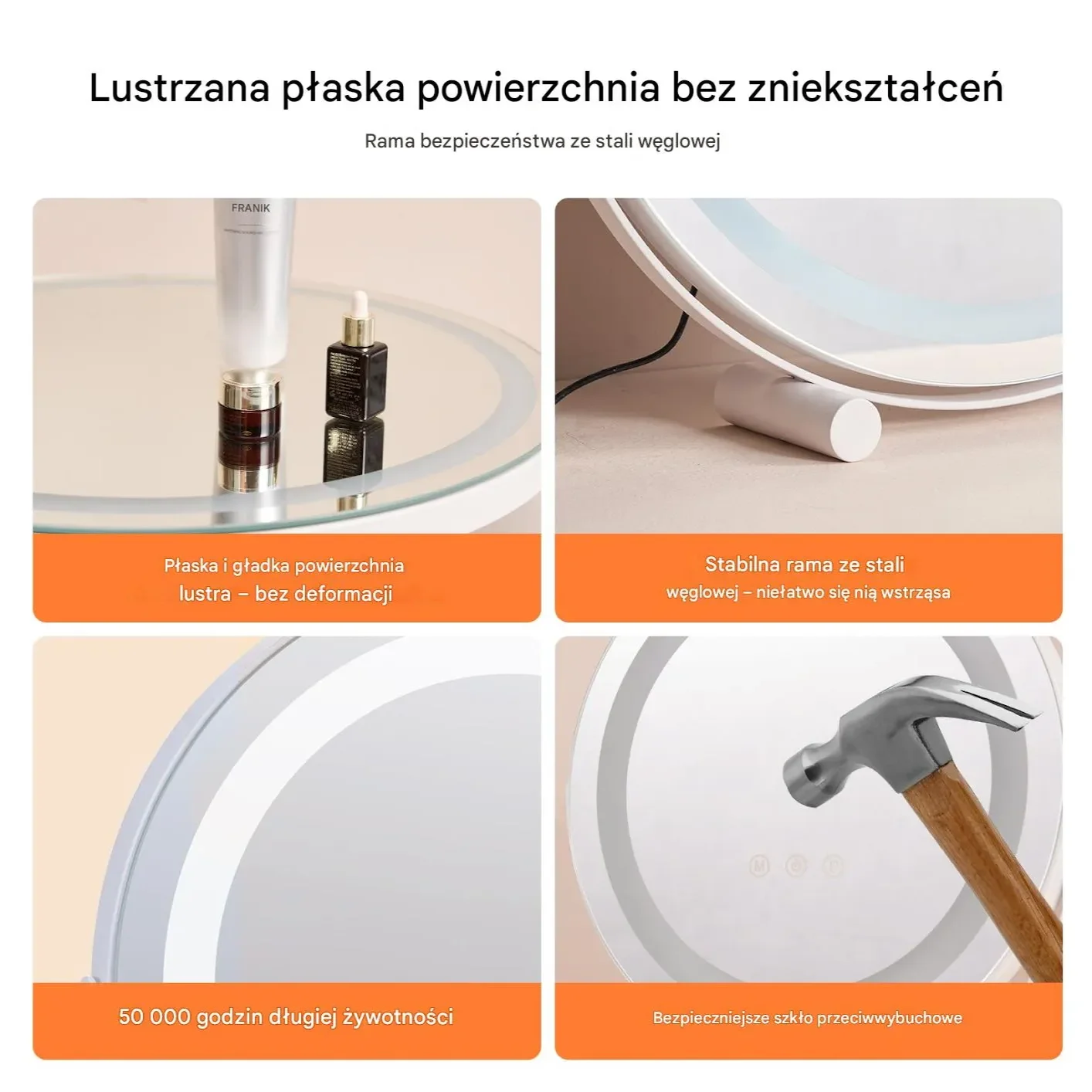 Elegancka, okrągła forma o średnicy 50 cm oraz solidna, stabilna podstawa sprawiają, że lustro doskonale sprawdzi się zarówno w sypialni, garderobie, jak i profesjonalnym salonie kosmetycznym.