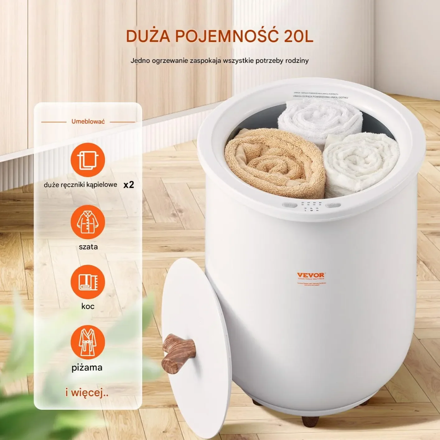 • Pojemność 20 litrów – możliwość jednoczesnego podgrzania wielu ręczników