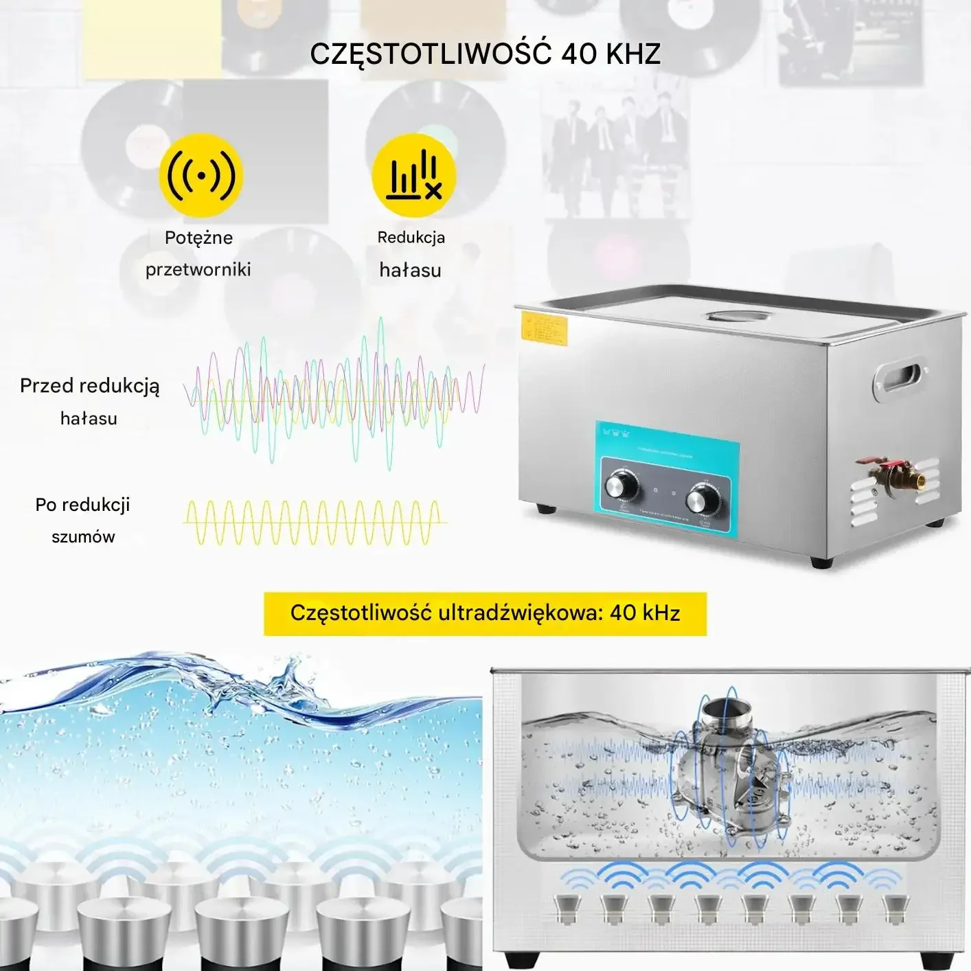- ✅ Skuteczne czyszczenie ultradźwiękowe: częstotliwość 40 kHz generuje miliony mikropęcherzyków, które wnikają w zakamarki, otwory i szczeliny, usuwając uporczywy brud, tłuszcz i osady