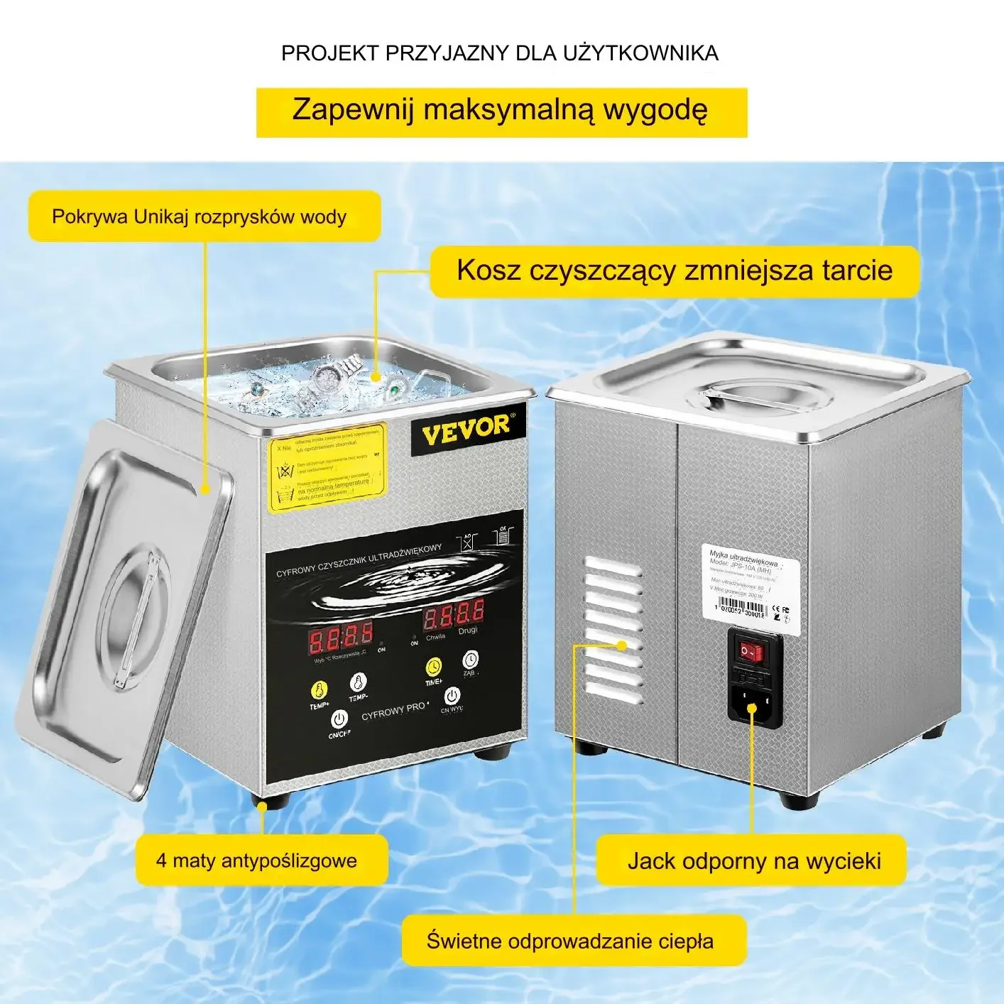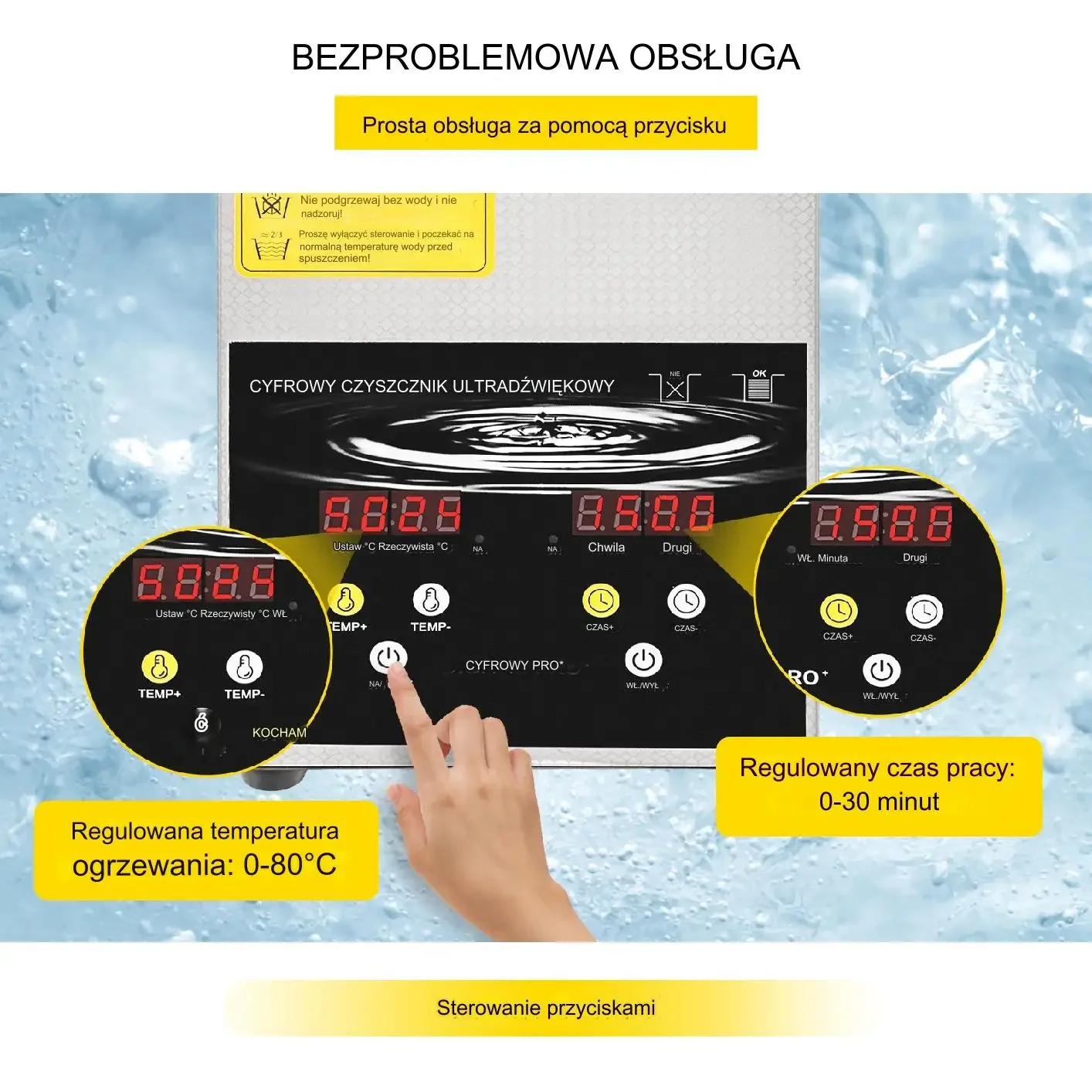 - ✅ Regulacja temperatury 0–80°C – optymalne warunki do czyszczenia różnych materiałów.