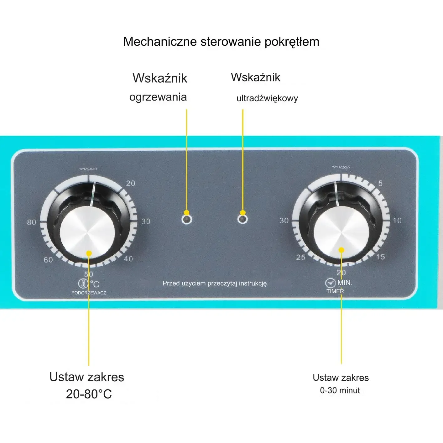Myjka do czyszczenia posiada dwa pokrętła umożliwiające precyzyjną regulację czasu i temperatury. Czas można dostosować w zakresie od 0 do 30 minut, natomiast temperatura jest regulowana w przedziale 20-80 ℃ (zaleca się utrzymanie temperatury poniżej 45 ℃, aby uniknąć uszkodzenia delikatnych przedmiotów). Dzięki tej funkcji, masz pełną kontrolę nad procesem czyszczenia, zapewniając optymalne rezultaty bez ryzyka uszkodzenia swoich przedmiotów.