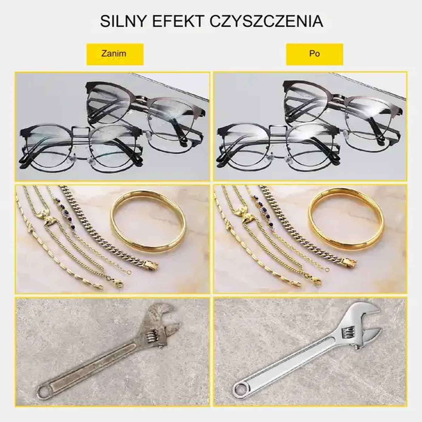 - ⭐ Biżuteria i zegarki – usuwa osady i przywraca blask pierścionkom, naszyjnikom czy mechanizmom zegarków.