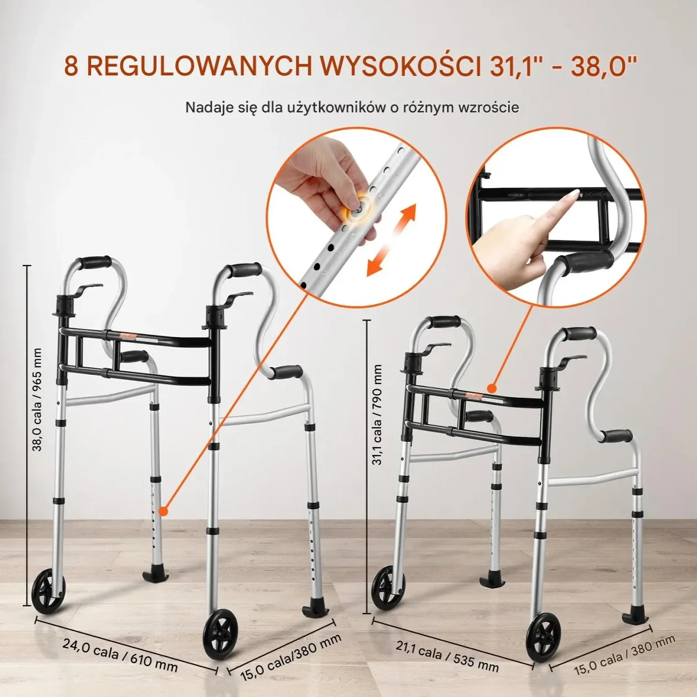 Chodzik Rehabilitacyjny Składany z Kołami – Regulowany, Nośność 204 kg