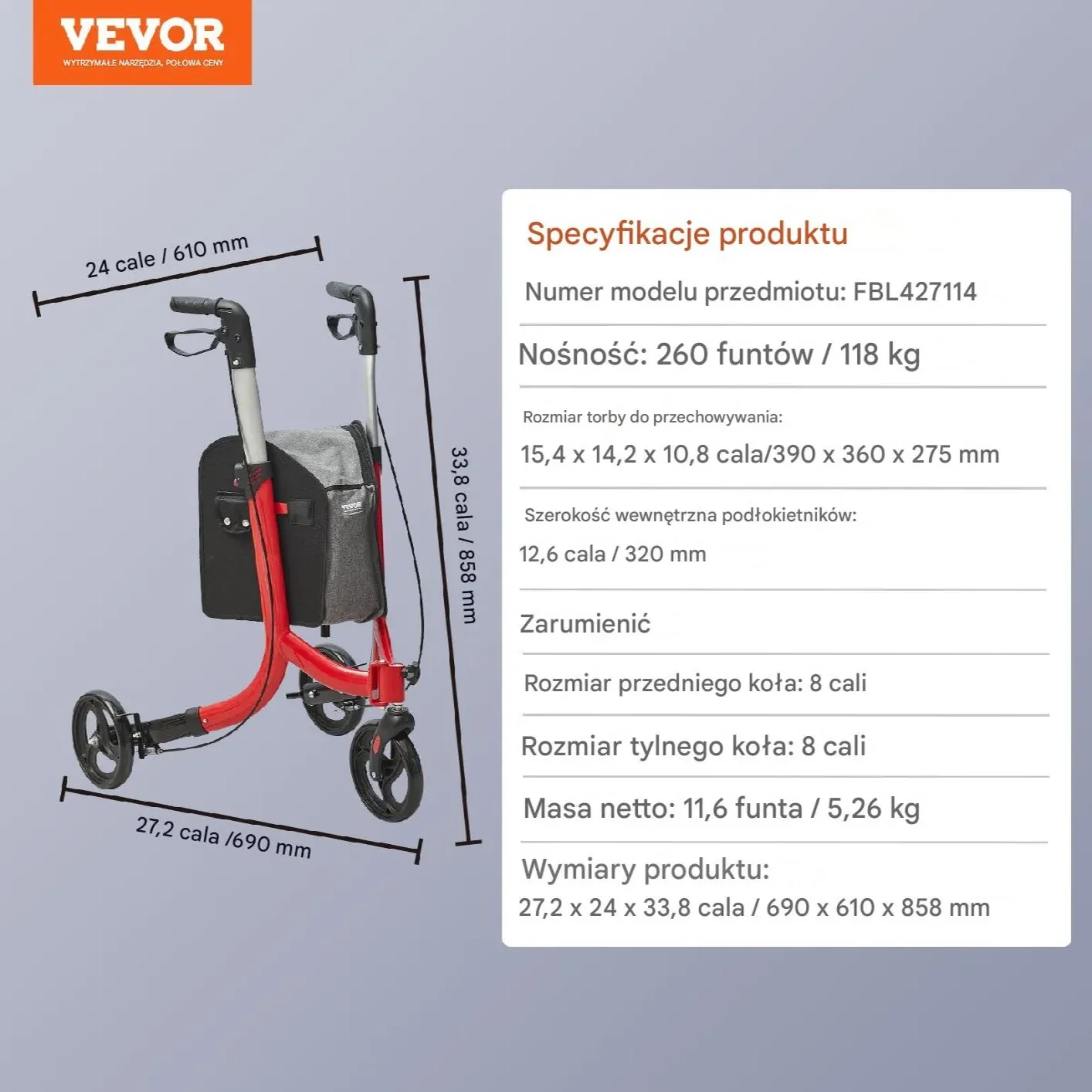 - Średnica kół: 12,7 cm (5 cali)