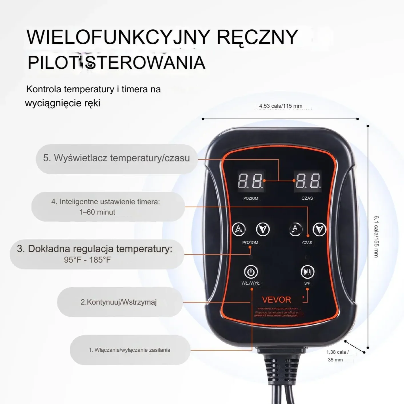 - ✅ Precyzyjna kontrola: Wielofunkcyjny pilot umożliwia regulację temperatury (6 poziomów) oraz programowanie timera (1-60 minut).