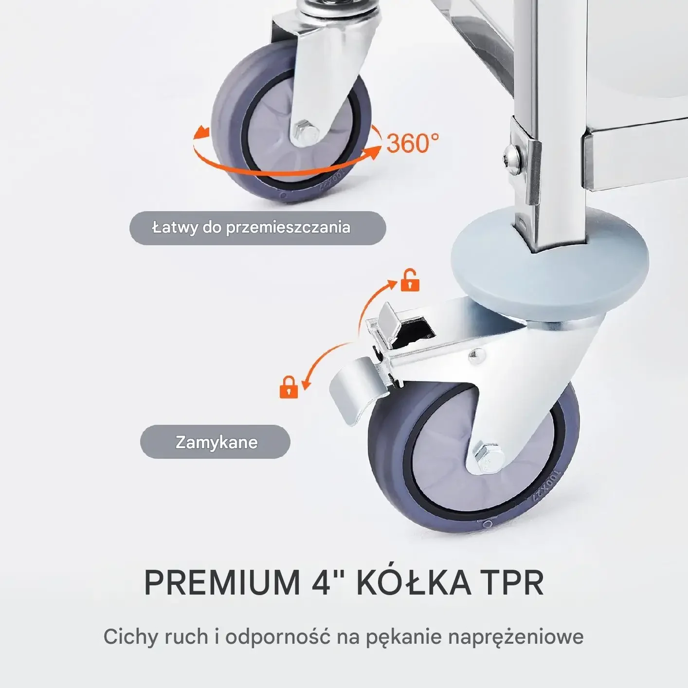 - ✅ Cztery kółka obrotowe TPR o średnicy 98,6 mm, dwa z hamulcami – ciche i stabilne przemieszczanie
